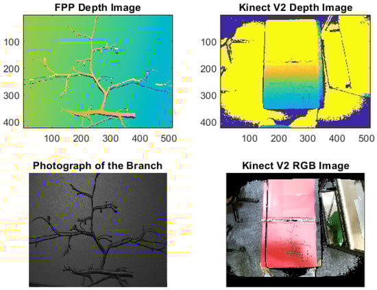 From the applications detailed in Section 1 on the works of Rosell-Polo et al., Wang et al., Xia et al., and Jiang et al. [23,24,25,28] it is clear that the Microsoft Kinect is a popular tool used in agriculture for depth sensing applications. Starting in 2014, the new version of this tool, the Microsoft Kinect v2, switched from structured light to time of flight-based depth sensing technology. Owing to its ease of use and affordability, it seems researchers have persisted with this device, and it is a popular tool for depth sensing in this industry. The Kinect does, however, have its disadvantages. While it is true that the speed of this sensor is sufficient for numerous applications, it is also true that it can fall short in a number of other situations. Firstly, while it is currently enough to keep up with the existing sorting line speeds of produce such as tomatoes and onions, should there be potential for an increase in line speeds, the existing machine vision technology could result in being a bottleneck for such lines. It would be ideal for these industries to use "future proof" machine vision technology so that they do not encounter this issue, and to that end, a high speed FPP-based machine vision system can be a better solution than adding multiple lines for the multiple lower speed sensors. There are also other applications, such as online crop phenotyping, that require a higher line speed (over 30 units per second) than the Kinect can handle. The FPP technique, when aided by the high-speed bitwise binary defocusing techniques, can perform image acquisition in the range of kilohertz [47], and is thus, a highly suited technology for these kinds of applications. Figure 14 demonstrates the depth images generated using the FPP system and the Kinect V2’s TOF camera for a tree branch. It is evident that the FPP system can capture the fine-scale features of the branch better than the Kinect, and is further proof of why it should be adopted in this domain.