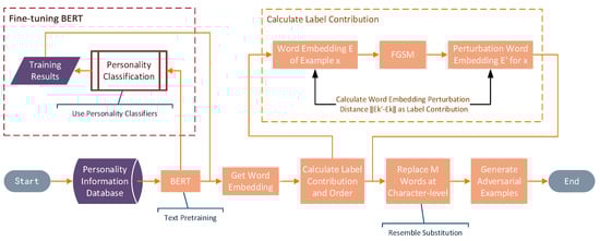 The overall block diagram of the SCRS is shown in Figure 1. We used BERT for text pre-training and the personality dataset to fine-tune the BERT model so that the word embedding obtained by BERT was more in line with our personality privacy protection task. Then, we used the FGSM to find the label contribution of the word, selecting the words that were important for the label to be modified according to the label contribution to generate adversarial examples.
