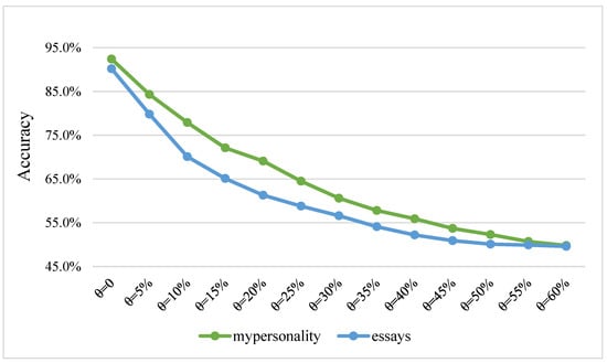 According to the above two variables, we conducted an attack experiment against the examples. The experimental results are shown in Figure 2. From the figure, we can see that after attacking the two datasets, the success rate of the classifier was around 50% when the word substitution ratio θ surpassed 50%. Since our task was a multi-label binary classification task, 50% of the classifications were accurate. The rate indicates that the classifier did nothing, proving that our attack was effective. Since our task was a multi-label binary classification task, a classification accuracy of 50% indicates that the classifier was not doing anything, proving that our attack was effective. With the increase in the word substitution ratio θ, the classification effect of the classifier showed a downward trend; that is, the attack effect became more and more obvious, and the adversarial samples generated by essays performed better than those generated by mypersonality. Moreover, with the increase in the substituted words, the rate of decline in the classifier effect slowly decreased, which suggests that a small modification to the word can cause the classifier to make an incorrect judgment. Thus, causing the classifier to fail for more samples became increasingly difficult. The table also shows the classification results under different attack strengths. The greater the attack strength, the greater the decline in the classifier’s accuracy. A decrease in the classification accuracy indicates that the classifier’s ability to judge personality privacy data had decreased, and the accuracy of personality classification had also decreased. This effectively plays a role in protecting personal privacy.
