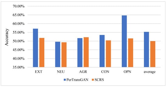 To verify the performance of the SCRS method, we compared it with the PerTransGAN method proposed in our team’s previous work [26]. The SCRS method uses generative adversarial networks (GANs) to protect the privacy of the personalities hidden in text data through text transformation. The classification accuracy of all five personalities generated by the PerTransGAN model decreased to different degrees, and the average classification accuracy remained at around 55%. However, our SCRC method caused the classification accuracy to decrease to around 50%, therefore showing better performance. We compared the degrees of decrease demonstrating the classification accuracy for the five personalities, as shown in Figure 3. The lower classification accuracy proves that the attack was more effective and also proves that the generation method to obtain adversarial samples was superior. The comparison experiments showed that our method performed better in terms of attack effectiveness.