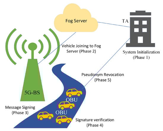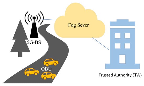 As described in Figure 1, our work’s architecture consists of the following four components: the trusted authority (TA), the 5G-base station (5G-BS), the fog server, and the onboard unit (OBU).