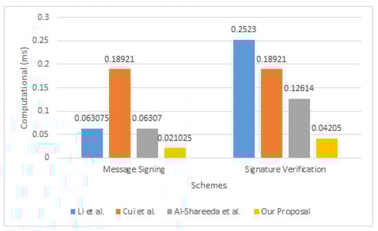 The efficiency of our work in signing messages and verifying signatures is compared to other relevant systems in Table 4. Figure 3 compares the computational costs for the proposal with other schemes.