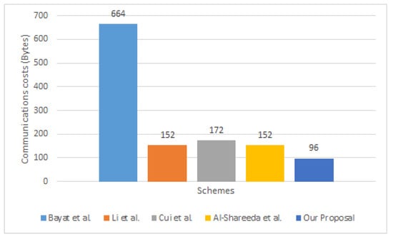 In this section, we present the authentication methods by comparing the relative overhead and transmission costs of the various methods of Bayat et al. [22], Li et al. [23], Cui et al. [24], and Al-Shareeda et al. [25] along with our proposed system of vehicular networks. Given that, this study makes the following assumptions: the product of a hash function is 20 bytes, the product of a timestamp is 4 bytes, the product of a bilinear pair point is 128 bytes, and the product of a point on an elliptic curve is 40 bytes. The message’s end result is not involved in this procedure. Table 5 displays a comparison of the communication costs.