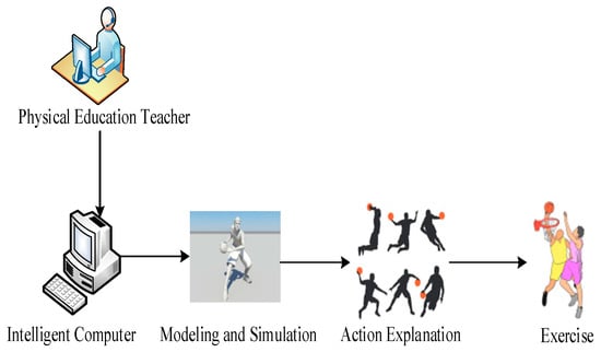 Sports is a subject that requires high learning ability. To accurately master the action essentials in various sports, students must learn for a long time, such as the passing action in basketball, the run-up action in running, and the bouncing action in soccer. Students cannot master it in a short PE class, which leads to poor teaching effect. As shown in Figure 2, teachers can strengthen the application of AI, simulate these actions through computer simulation technology, and explain the action essentials through slow video playback. After the completion of the explanation, the teacher can also set up action learning tasks through the computer so that students can master various motor skills independently through the computer, which also indirectly realizes human–computer interaction. Outside the school, teachers can use AI modeling technology to prepare learning models for students and demonstrate 3D learning assignments so that students can learn by themselves. Teachers can observe the students’ movement process in the system terminal, record the changes of students’ physical conditions with the exercise intensity, and provide personalized guidance to students by collecting data. If some students cannot complete the tasks set, the teacher can change the settings of the simulation system to reduce learning difficulties to ensure learning efficiency. The application of AI technology in class and extracurricular environments can enable students to understand sports knowledge well, improve their self-confidence and sports skills, and lay a solid foundation for students to develop towards sports majors.