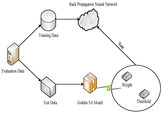 First, the teaching quality evaluation dataset is divided into training set and test set. The training set is trained and processed through the BPNN model, and the test set is calculated through Gold-SA. Then the optimal threshold and weight values obtained are input into the BPNN model for testing. The specific calculation process is as follows: