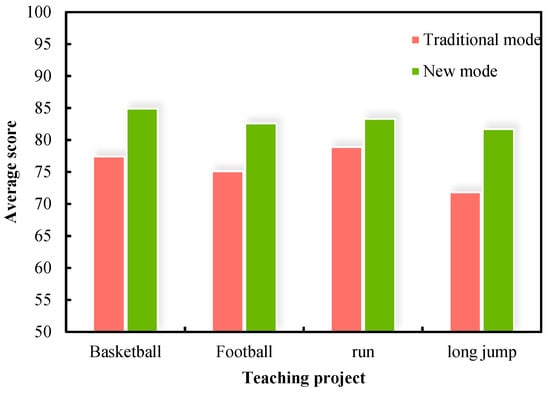 It can be seen from the histogram in Figure 4 that under the traditional model, the average score of the four sports was maintained between 70 and 80 points, and the highest average score was running, at nearly 79 points. Under the new model, the average score of the four sports was maintained between 80 and 85, and the highest average score was nearly 85 for basketball. In vertical comparison, the biggest difference between the average scores of the two models was the long jump, which was nearly 10 points. According to the changes in the average scores of four sports activities under the two models, the new model is effective in improving sports results. There is no significant difference.