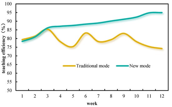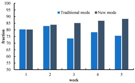 It can be concluded from the scoring in the above figure that in the traditional model, the teaching quality score was between 70–85 points. In the first two weeks, the teaching quality was still higher, while in the last three weeks, the score fell below 80 points. Under the new teaching model, the teaching quality in the first week reached more than 80 points, and the scores in the next four weeks were constantly rising. By the fifth week, the scores exceeded 88. These ratings also show that the new model is constantly improving the quality of teaching.