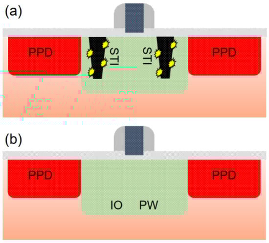 As shown in Figure 4a, shallow trench isolation (STI) is usually used as the physical isolation between pixels. However, the STI process requires a plasma etching process, which will cause plasma damage on the side walls of the trench. Although an annealing process is added immediately for defect removal, many defect energy levels are still generated on the Si-SiO interface [11,12]. Moreover, when the defect energy level distribution is close to the depletion region, a large amount of dark current will occur, and the performance of the pixel unit will be degraded.