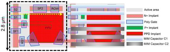 In this pixel, the source follows transistors SF1 and SF2 and the bias transistor PC operate in the saturated region, and the ROW selection transistor ROW operates in the linear region so that the pixel output voltage can linearly follow the sampling voltage on C2. As shown in the right cell of Figure 5, two capacitors C1 and C2, store the reset signal and the electrical signal after photoelectric conversion. C1 and C2 in this paper use MIM (Metal Insulator Metal) capacitance. Since the MIM capacitance is formed in the back-end interconnects layer, it does not occupy the active area. Moreover, its area can occupy the entire 2.8 μm pixel unit, effectively increasing the capacitance value and reducing the noise. MIM capacitors, different from MOS capacitors, will not respond to the incident light, and the use of low leakage and high dielectric constant materials as capacitor dielectric layer makes the pixel unit noise smaller.