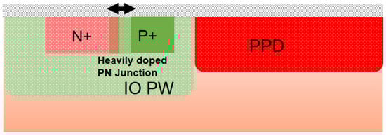 The results obtained through the research are as follows. As shown in Figure 6, the two adjacent areas are implanted by heavily doped N-type and P-type implants. Even though there is a certain distance between the N+ and P+ areas on the layout, since the STI isolation is removed, the N+ and P+ area will be connected after the final diffusion, forming a heavily doped PN junction. This part of the PN junction leakage may be collected by the PPD, causing the unwanted dark current. The ideal PN junction reverse bias current equation is shown as follows: