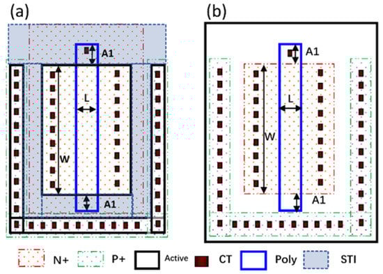 Figure 7. The schematic layout of a single transistor with (a) STI and (b) merged active area.