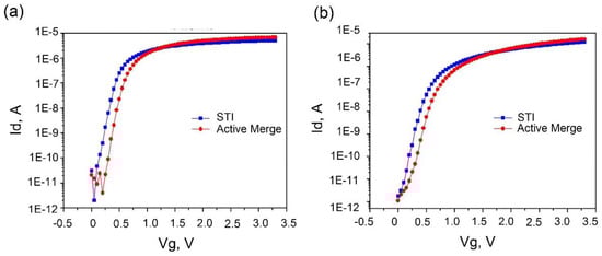 Figure 8. The effect of Merged active area on Id vs. Vg curves in a single transistor under (a) Vd = 0.1 V and (b) Vd = 3.3 V.
