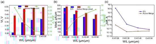 Then, parameters VT, Idsat, and Ioff of MOS devices with sizes of W/L = 0.4/0.28, 0.4/0.38, 0.4/0.48, 0.4/0.58 μm before and after the active region merging were tested. Three devices of each size were tested on silicon wafers and their average value was taken for analysis. As shown in Figure 9a, VT increases after the active region is merged, and the VT of the four devices increases by 0.228, 0.184, 0.162, and 0.158 V, respectively, and the increase in VT decreases as the channel becomes longer. As shown in Figure 9b, the Idsat increases by 5%, 17%, 22%, and 26%, respectively, after the active region is merged. The increase ratio increases with the length of the channel. As shown in Figure 9c, after the active region is merged, the leakage current Ioff can be effectively improved, especially when the channel length is smaller.