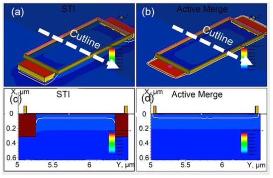 Figure 10. TCAD simulation structure of a single transistor with (a) STI and (b) merged active area. (c,d) are the cross-sections at the corresponding cutline in (a,b).