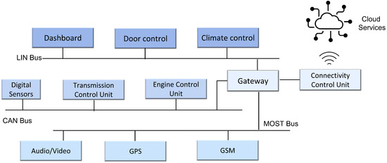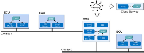 The proposed security system, as illustrated in Figure 2, incorporates multiple control units executing our proposed security services. Usually, a CAN system includes multiple ECUs, digital sensors, and a CCU for cloud communication. The proposed architecture follows the same approach.
