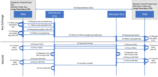 Outlined in Figure 4, the first scenario assumes that Proto-LTK was executed beforehand and consists of two phases. In the first phase, Proto-STK is executed, and in the second one the MixCAN protocol is carried out.