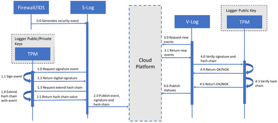 Workflow presenting the processing steps performed by the S-Log and V-Log services to sign and verify with the TPM a security event generated by the SF/IDS.