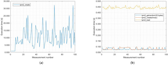 Performance measurements of TPM commands that handle the generation of cryptographic keys and the loading process into the TPM. (a) tpm2_create command. (b) tpm2_getrandom, tpm2_create(hmac), and tpm2_load commands.