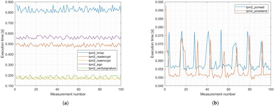In Figure 6 the performance measurements for generating cryptographic keys and the key loading command are displayed. For example, the tpm2_create command has an average execution time of 10.237 s, with a maximum of 32.330 s, and a minimum of 0.806 s. To load the generated asymmetric key generated by tpm2_create, tpm2_load shows an average time of 0.441 s, a maximum of 0.425 s, and a minimum of 0.469 s. On the other hand, in Figure 7a, it can be observed that the tpm2_rsaencrypt command is faster than tpm2_rsadecrypt, with an average execution time of 0.168 s, while the latter time is 0.486 s. Similar numbers can be observed for the tpm2_verifysignature and tpm2_sign commands. Lastly, Figure 7b showcases the execution times for tpm2_pcrread and tpm2_pcrextend commands used by S-Log and V-Log.