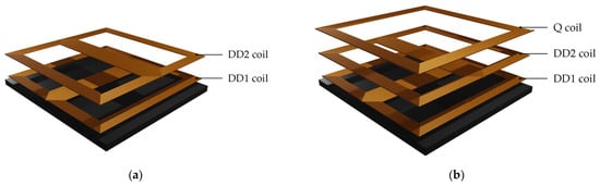 The exploded coil topologies are presented in Figure 1. Figure 1a presents an exploded view of the double DD coil or 2DD coil structure, which consists of a ferrite plate and two DD coils. The bottom DD coil is called a DD1 coil and the top a DD2 coil. Figure 1b presents an exploded view of the double DDQ or 2DDQ coil structure. It consists of the DD1, DD2, and quadrature Q coils. All three coils in the 2DDQ coil structure are not coupled magnetically, which means that they can be excited by three different excitation currents.