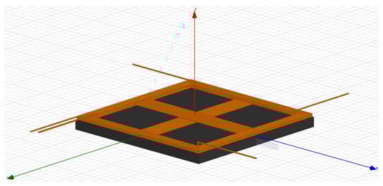 The 3D model used in the simulation is presented in Figure 2. The coils were modeled to be as close to the experimental coils as possible. The coils were placed on top of the ferrite material, which guides and blocks the magnetic field and increases the self-inductance of the coils. The modeled DD1 and DD2 coils had the same size, shape, and number of turns. The DD2 coil was placed on top of the DD1 coil and rotated by 90°, thus forming a double DD coil structure. The additional quadrature Q coil was placed on top of the bipolar DD coils. The main purpose of the simulation was to confirm that the coupling coefficient between each of the three coils was nearly zero. The 2DDQ coil structure consisted of three layers. The bottom layer was DD1, second DD2, and the third, the Q coil. Each of the coils had two terminals and were excited by a current with a peak value of 1 A and frequency of 87 kHz. The phase angle between three currents was set to zero.