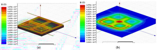 ANSYS Maxwell can also be used for graphical representation of the magnetic flux density B. The results are presented in Figure 3. In Figure 3a, the magnetic flux density is represented using the vectors, and in Figure 3b, using a color scale. The coils were not coupled; however, their magnetic field did interact. The interactions can be constructive and destructive. Constructive interaction increases the magnetic flux density and destructive decreases the magnetic flux density. The simulation results are presented only for the case when all their excitation currents were in phase.