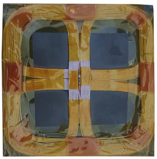 A small-scale prototype of the coil was built to test the concept and verify the simulation of the double DDQ coil. The size of the coil structure was determined by the size of the ferrite material. The small-scale prototype coil is presented in Figure 4. The footprint of the coil was 100 mm × 100 mm. Each of the DD coils had 18 turns (9 per D coil) and Q coil had 13 turns. The Q coil was wound to have approximately the same inductance as the DD coils. Both the transmitter and the receiver coil had the same physical dimensions.