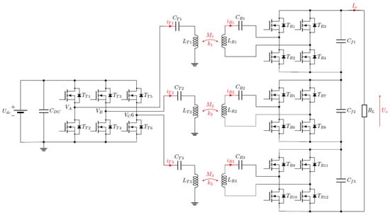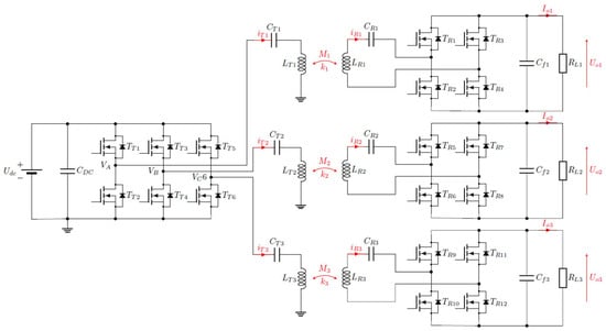 The transmitting part of IPT presented in Figure 5 and Figure 6 are the same. The main difference is in the configuration of the receiving part. In both cases, each of the receiver coils is connected to its own active rectifier. In Figure 5, each of the active rectifiers provide power to their own resistive load. On the other hand, in the case presented in Figure 6, the three rectifiers were connected in series to power only one load. The output voltage across the load was the sum of all three rectifier voltages: