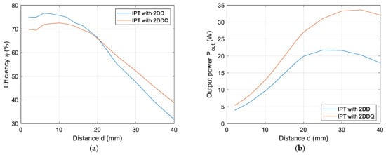 Figure 8 presents the comparison of the wireless power transfer using the double DD coils and the wireless power transfer using the double DDQ coil. The results of the IPT system using the double DD coil are marked with the blue line, and the results of the double DDQ coil are marked with the red line. Figure 8a presents the comparison of the system efficiency, and (b) presents the comparison of the output power of the IPT system. From Figure 8a, it is evident that, at smaller distances, the IPT system with the double DD coil was more efficient. As the distance increased above 20 mm, the Q part of the 2DDQ coil structure became more efficient, resulting in an overall larger efficiency. However, the overall efficiency of the system was below 65%, which can be increased by using larger coils and better system optimization.