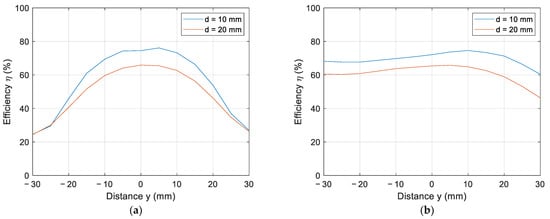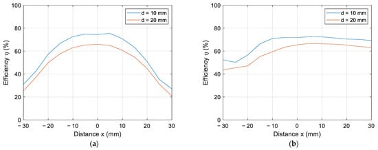 Misalignment tolerance of the IPT system using 2DDQ coils at z = 10 mm: (a) in the x-axis direction; (b) in the y-axis direction.