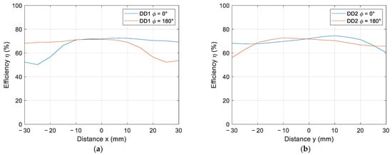 The main contributor to non-symmetrical misalignment tolerance is the magnetic flux density distribution, presented in the second chapter. By changing the phase angle between different excitation voltages and currents, this distribution should change. Therefore, by changing the phase shift angle, symmetrical misalignment tolerance should be achieved. This was confirmed with measurements, presented in Figure 11a,b. Figure 11a presents the misalignment tolerance in the x-axis direction. The blue line represents the case when the phase angle of DD1 was 0°. The red line presents the efficiency of the system when the phase angle of DD1 was 180°. In the negative direction, the phase angle should be 180° and in the positive, it should be 0°.