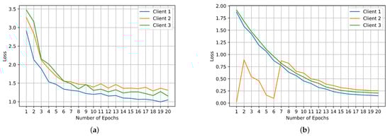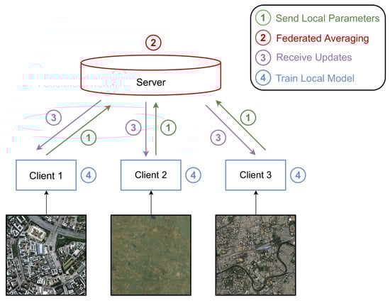 For the application proposed in this paper, the goal is to adopt a federated learning approach in developing a shared deep learning model for the semantic analysis of satellite and street view images. The federated averaging algorithm (FedAvg) was first employed for distributed machine learning over a horizontally partitioned dataset []. In federated averaging, each party uploads the clear-text gradient to a coordinator independently, then the coordinator computes the average of the gradients and updates the model. Finally, the coordinator sends the clear-text updated model back to each party. The federated averaging (FedAvg) algorithm works well for certain non-convex objective functions under independent and identical (IID) settings but may not work in non-IID datasets [].