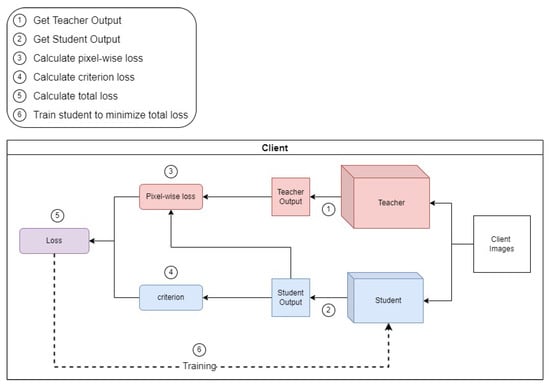 In Figure 2, the teacher–student knowledge distillation workflow is illustrated. This is the interaction that happens at every client location. For the teacher model, we used UNet with around 17 million parameters. We implemented the knowledge distillation framework for a larger CityScapes dataset. For the student model, we used an approach to downsize the UNet presented in an existing work [,]. We proposed a much smaller FCN network that was derived by taking the architecture of the original UNet and reducing the number of layers and parameters in the structure. The kernel size of the convolutional layer was kept the same, i.e., 3 × 3. Our proposed model has 2 downsample and upsample layers each (vs. 4 of each in the original UNet). The filters in these convolution blocks were reduced to 16, 32, 32, and 16 vs. 64, 128, 256, 512, 512, 256, 128, and 64 of the UNet model. This reduction in the number of layers and the filters in these layers gave us a much smaller model with 118,000 parameters. The performances of the models and related discussions are presented in the following subsections. Algorithm 1 describes the model-building process and details of the communication rounds. The server procedure describes the global update rounds and aggregation process; the UKDLearning procedure explains the teacher–student knowledge distillation process. Algorithm 1 helps one to understand the overall workflow of the proposed FL framework for designing a UNet model through knowledge distillation to save communication costs.