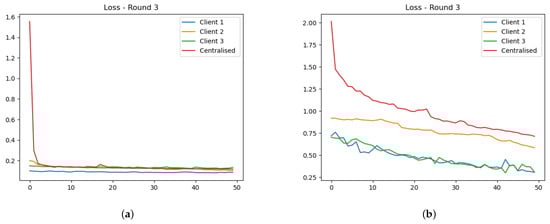 The Chennai land use (CLU) dataset comprising 60 images was divided among 3 client nodes under a label-skewed scenario created for analyzing the effectiveness of the federated approach of model-building. The results after the third communication round of global updates to the clients are presented in Figure 5a. The performance using a centralized model was also captured in order to compare the performances on the designated test images for both centralized and federated learning approaches. The cross-entropy loss for 50 epochs can be observed for the 3 clients and the centralized approach. The performance was found to be more than 95% in all cases for 10-fold cross-validation. Similarly, the performance of the CityScapes dataset is presented in Figure 5b. A sample size of 118 images were used in a label-skewed scenario distributed across 3 clients. For the FedUKD experiment, there were 10 communication rounds; each with two epochs of training. The graph of the results represents cumulative epochs (Figure 6a). Communication and federated averaging happen after every two epochs. For the best results, the temperature was set at 5 and the learning rate alpha to 0.3. Both CityScapes and Chennai land use datasets were pre-processed to be non-IID as described in Section 3.