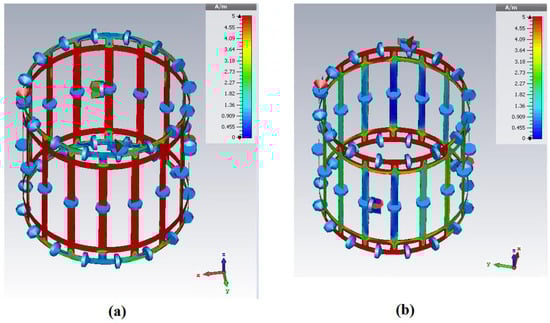Surface current distribution (A/m) of the 7 T four-ring DT-RF birdcage coil model at the sodium (78.86 MHz) (a), and proton (298.03 MHz) (b), Larmor frequencies.