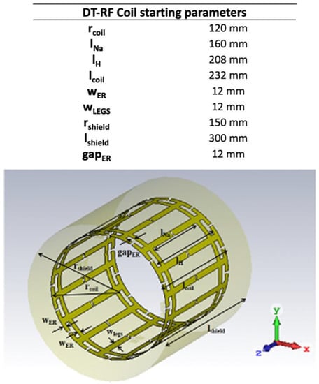 From the inspection of data in Table 3, we observe how the four-ring DT-RF coil efficiency does not change significantly varying the geometrical parameters. This is an indication that, for this type of coils, the design can be optimized in terms of the desired homogeneity at the two resonant frequencies (with the constraints related to the target body district), with limited trade-off in terms of coil efficiency. The latter is instead highly dependent on the coil-to-shield ratio [], a parameter we did not considered in this study.