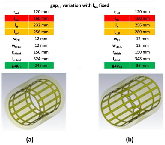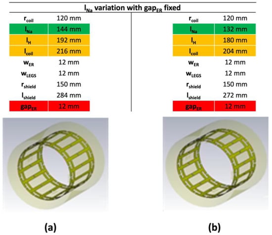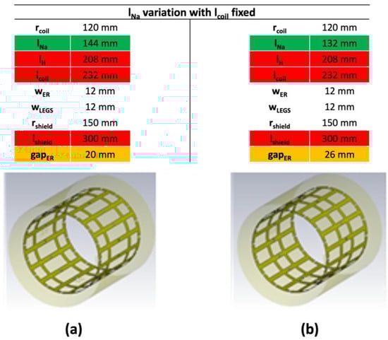 EM CAD model of the four-ring DT-RF coil model versus the geometrical dimensions. The lNa variable parameter is in green, while the parameters changing with the lNa parameter are in orange (gapER). In red are the fixed parameters (lH, lcoil, lshield).