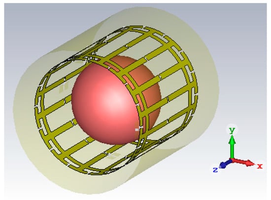 EM CAD model of the four-ring DT-RF coil model with the spherical phantom positioned at the center.