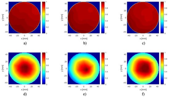 Normalized transverse || field maps of the four-ring DT-RF coil model on the central plane (z = 0). In (a–c) for the 7 T sodium Larmor frequency of the ‘long’, ‘short’ and ‘intermediate’ configuration, respectively. In (d–f) as for the first row but for the 7 T proton Larmor frequency.