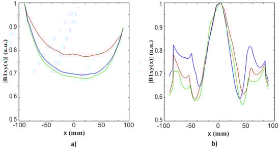 Transverse || profiles along the x-axis at the sodium (a), and proton (b), Larmor frequency of the 7 T four-ring DT-RF coil model for the ‘long’ (red line), ‘short’ (blue line) and ‘intermediate’ (green line) configurations.