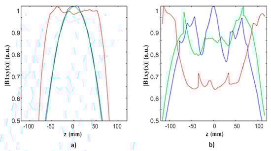 To give a closer look on the spatial RF field homogeneity in the following we will concentrate on the comparison among three geometrical configurations, named accordingly to the length of the proton birdcage lH as: long (lH = 256 mm, Figure 3b), short (lH = 180 mm, Figure 4b), and intermediate (lH = 208 mm, Figure 5b). The normalized transverse field maps on the central plane (z = 0) of these configurations are reported in Figure 7 for the 23Na and 1H Larmor frequencies. Figure 8 and Figure 9 show, respectively, the profiles along the x-axis and z-axis for the three considered geometrical configurations.