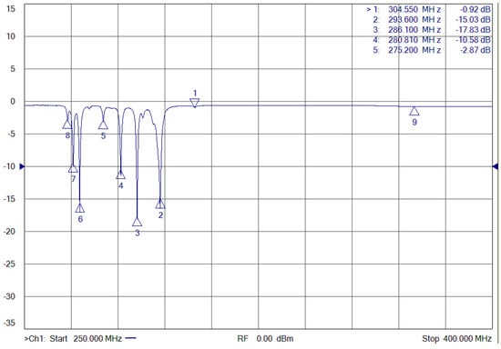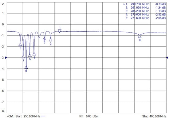 Full spectrum of a single outer birdcage-like structure in absence of capacitors on the inner and opposing outer structures (frequency sweep for 250 to 400 MHz).