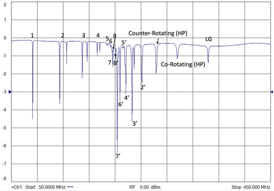 Measured S11 full spectrum of the four-ring DT-RF coil prototype with both sodium and proton resonant structures connected, frequency sweep from 50 to 450 MHz. Numbers without apex refer to the LF resonant modes (1 to 8) with frequencies 81.8, 130.4, 162.1, 184.6, 197.7, 203.3, 205.1, 207.0 MHz. Numbers with apex refer to the HF resonant modes (8′ to 2′) with frequencies: 209.8, 213.6, 217.3, 222.0, 226.6, 237.9, 250.9 MHz. Counter-Rotating and co-rotating HP modes have frequencies of 273.4 and 306.1 MHz, respectively, and the LG label refers to the end-rings mode of the HP structures, which generates a longitudinal magnetic field.