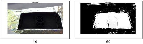 Further, since the aim was to examine the ultimate capabilities of the developed algorithm, the colors and shades of the vehicle body model are chosen so that the glare, noise, and artefacts are as pronounced as possible, or that the complete socket surrounding will be very dark to absorb light and thus spoil the input RGB and depth images. The socket and the surrounding where it is mounted are very dark (on real vehicles also) and, thus, they absorb light and the socket looks dark in the presented examples. Additionally, it should be noted that the vehicle body model is tilted a little to reflect the real situation, because real vehicles also narrow in a truncated pyramid shape in the upward direction around the socket position, and that is the reason why the presented examples will look like they are being captured from above slightly. Hence, the socket is observed from in front with minor displacements, and that will also be the intent in the real application. The depth sensor was positioned approximately 20–22 cm from the vehicle body model; thus, the CCS2 socket was approximately 24–28 cm from the camera. It should be mentioned that the minimal working distance of ZED 2i is 20 cm, since according to Stereolabs’ documentation, the dead zone of the sensor is starting from 19 cm [