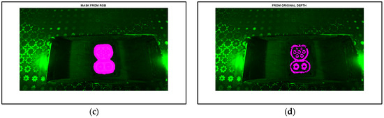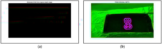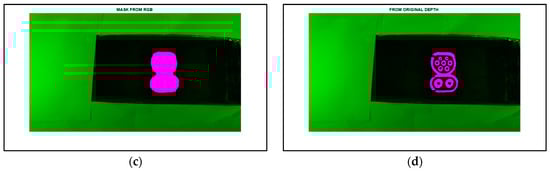 Figure 10b, the resulting image is converted to 8-bit depth resolution in order to be visible, and the accuracy of the detected CCS2 socket from the original depth map can be observed relative to the input RGB image. The pink surface region is the extracted CCS2 socket from the original depth map, and here it overlaps the input RGB image in order to highlight the accuracy of the detection.
