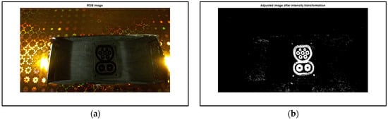 where γ and c are positive constants [14]. This gamma correction-based intensity transformation with fractional values of γ maps a straight range of dark input values into a wider range of output values, with the opposite mapping for higher values of input intensity levels. Parameter γ defines the shape of the transformation curve that maps the intensity values from input f to output g [14]. If γ is less than 1, the mapping is weighted toward higher output values, while if γ is greater than 1, the mapping is weighted toward lower output values [13]. The intensity transformation is performed jointly with contrast stretching, where the narrow interval of input intensity values is expanded into a wider interval of output values [14]. In this algorithm, the value of γ is 0.001. This value of γ eliminates the brighter background of the CCS2 socket and retains the dark socket components and textures in the image. As shown in Figure 5b, almost the whole area around the charging socket is eliminated. The remained connector elements contain noise that will be suppressed later with additional processing.