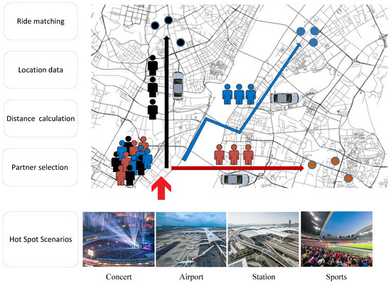 In order to solve the problem of privacy disclosure, different privacy-preserving plans for ride services (ride hailing and ride sharing) have been proposed in the past few years, based on encryption techniques [7] or location obfuscation methods [8]. By using spatial masking [9], differential privacy [10], k-anonymity technology [11], location obfuscation methods are efficient to protect location privacy. However, they sacrifice the accuracy of the location and provided inferior services. On the other hand, encryption-based solutions, such as Searchable Symmetric Encryption [12] and Private Set InterSection [13], provide accurate location services and privacy preservation. Homomorphic encryption (HE) schemes can provide a ride matching service by calculating the distance between users over the encrypted data while protecting the location privacy of users. However, these algorithms have high computational complexity, and the operations of encryption, decryption and computation cost too much time. Moreover, with a large amount of service requests, the calculation complexity increases fast with order . The SP has to execute a lot of calculations on encrypted ciphertexts. In hot spot areas, a large number of users may apply for a ride sharing service in a short time. Considering that many people come out of a railway station or a gymnasium after a sports game or a concert, respectively, there are many requests in short time, as shown in Figure 1. In order to provide a ride matching service, the system has to encrypt the location information of all users and calculate the travel distance of different matching combinations. It takes much time to encrypt data and calculate the distance, which is not acceptable.