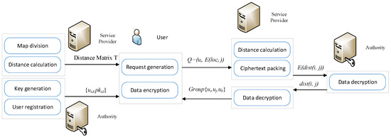 In order to protect users’ location privacy, we use homomorphic encryption technology to encrypt users’ location information. Homomorphic encryption (HE) is a kind of encryption scheme which has a special property—homomorphism. It allows a third party (e.g., cloud, service provider) to perform certain computable functions on the encrypted data while preserving the features of the function and format of the encrypted data [25]. As an example for an additively HE scheme, for plaintext and ,