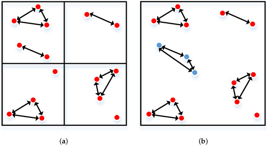 Example of multiple rounds of matching process. (a) Users (depicted as red points) match in a small range; (b) The remaining users (depicted as blue points) perform the second round of matching.