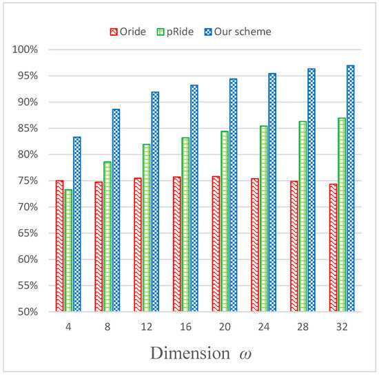 Figure 5 illustrates the matching accuracy under different dimension of the road network matrix. The matching accuracy of pRide and our scheme rises as the dimension increases, because when users upload more location information, the system can calculate the distance between users more accurately and provide accurate matching services. We can see the accuracy in our scheme is above 90% if the dimension reaches 12, which is practical in daily life. The ORide scheme is based on European distance, so the accuracy is lower than the other two schemes in most cases. Our scheme considers the complexity and time variations of the road network and, therefore, has the best performance.